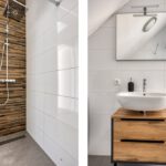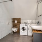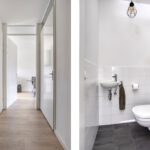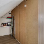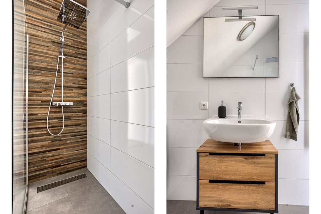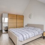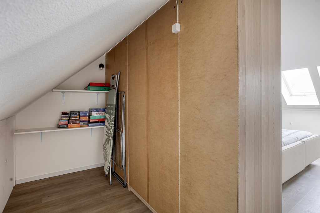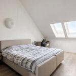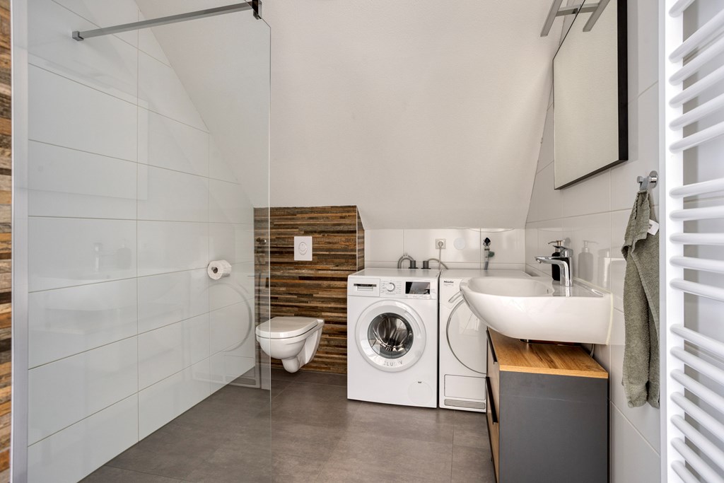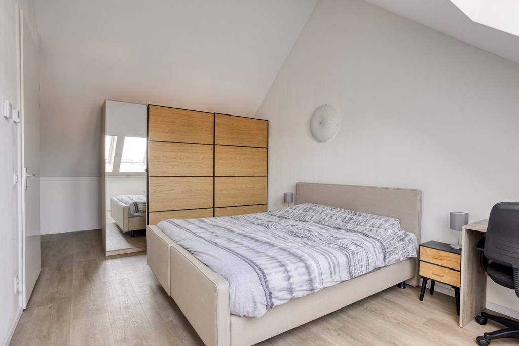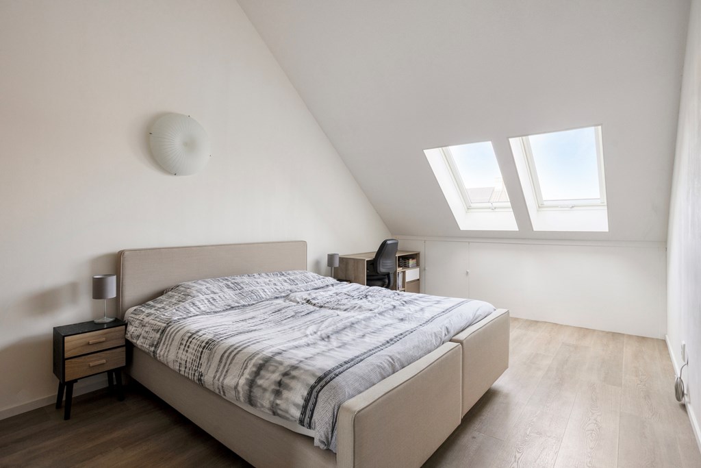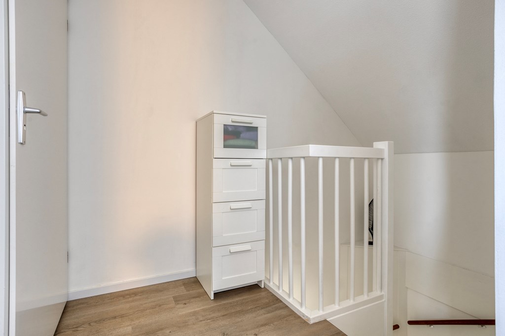 Vanuit de overloop is er toegang tot de slaapkamer en de badkamer. De badkamer is geheel betegeld en v.v. een hangend toilet, een inloopdouche met regendouche, een wastafel met meubel en een designradiator. De vloer van de badkamer is v.v. vloerverwarming en vloerkoeling. Tevens zijn hier een elektrische radiator en de aansluiting voor de wasmachine gesitueerd. Op de slaapkamer is een kledingkast geplaatst met daarachter extra bergruimte. De vloer van de slaapkamer en overloop is v.v. pvc met vloerverwarming en vloerkoeling. De wanden zijn v.v. stucwerk. De plafonds zijn afgewerkt met spuitwerk. De kozijnen zijn v.v. hout met HR++ glas.