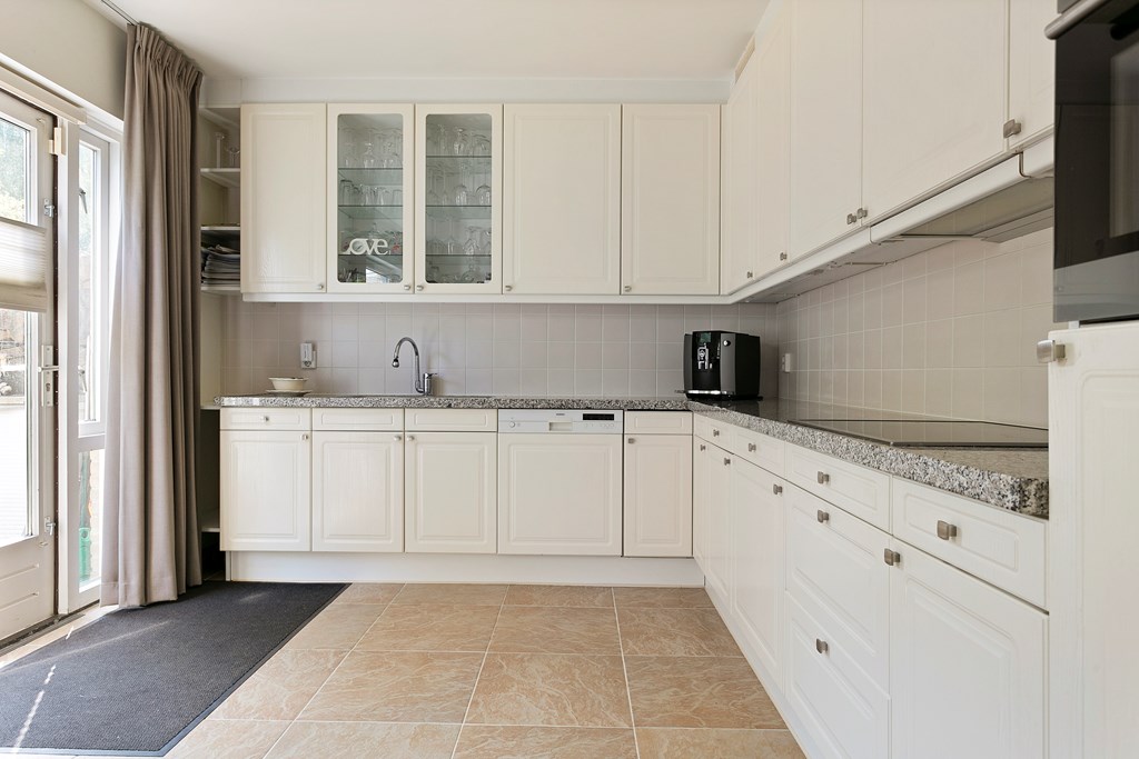 Via de hal/entree, met meterkast, trapopgang naar de eerste verdieping en garderobe nis, is er toegang tot de woonkamer en het toilet. Vanuit de woonkamer, met sfeervolle pelletkachel en openslaande deuren naar het overdekte terras, is de halfopen keuken bereikbaar. De keuken in L-opstelling beschikt over diverse kasten en lades, een granieten aanrechtblad, een spoelbak met mengkraan, 4-pits keramische kookplaat (2021), afzuigkap (Itho), combimagnetron/oven (Etna, 2021) vaatwasser (Siemens) en koelkast (Bauknecht). Vanuit de keuken is er toegang tot de fraai aangelegde achtertuin. Het toilet is geheel betegeld en v.v. een hangend toilet en fonteintje. De vloer van de benedenverdieping is deels voorzien van parket en deels betegeld. De wanden en plafonds zijn v.v. stucwerk. De kozijnen zijn deels van hout en deels van kunststof en zijn v.v. isolerende beglazing (HR++). Aan de voorzijde van de woning zijn de kozijnen voorzien van screens.