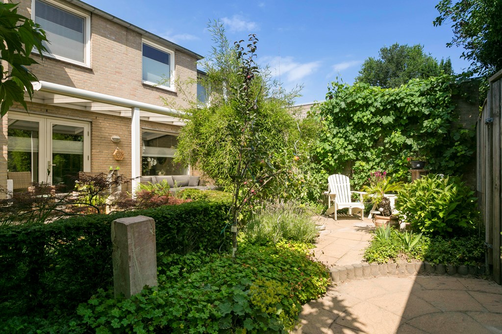 De fraai aangelegde achtertuin is bereikbaar vanuit de keuken en de woonkamer. De tuin is aangelegd met sierbestrating, vlonder terras, vijver en diverse borders met beplanting. Achterin de tuin is er nog toegang tot de ruime garage met elektrische sectionaaldeur.