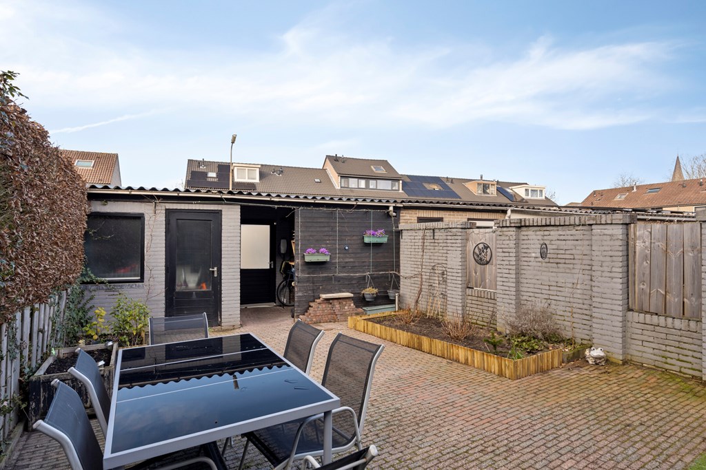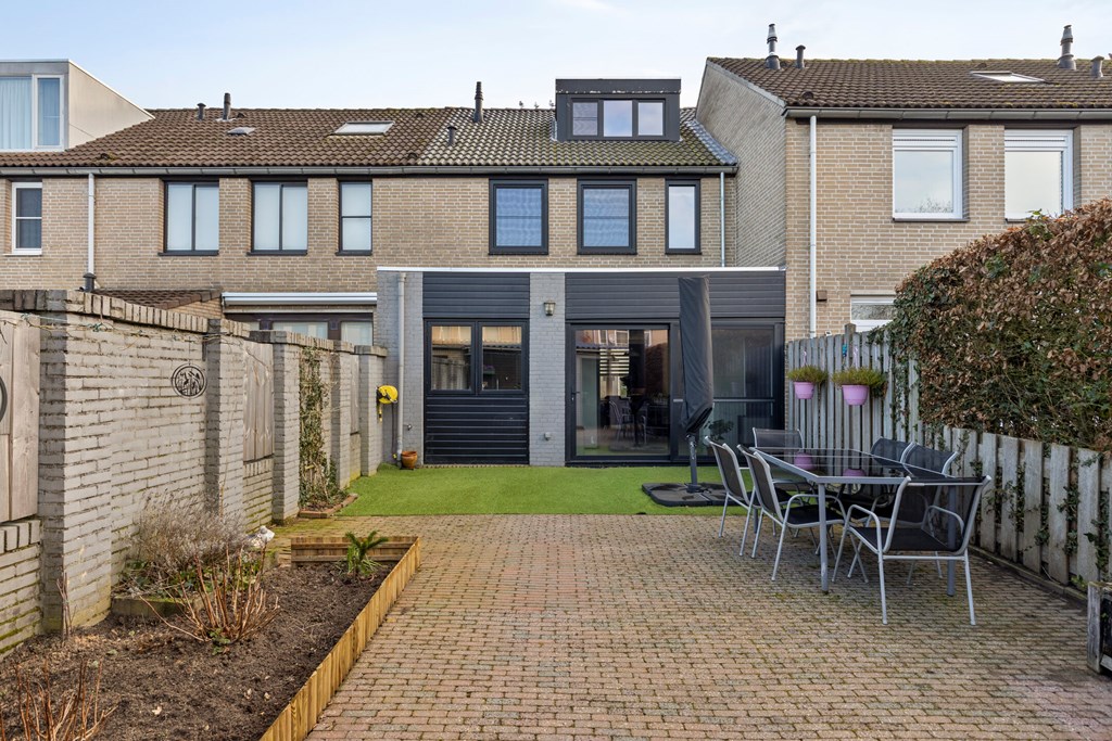 De achtertuin, gelegen op het noordwesten, is aangelegd met sierbestrating, kunstgras en borders en bloembakken met vaste beplanting. Achter in de tuin bevinden zich een berging met een overkapping. De achtertuin is bereikbaar middels een achterom met poort.