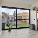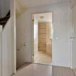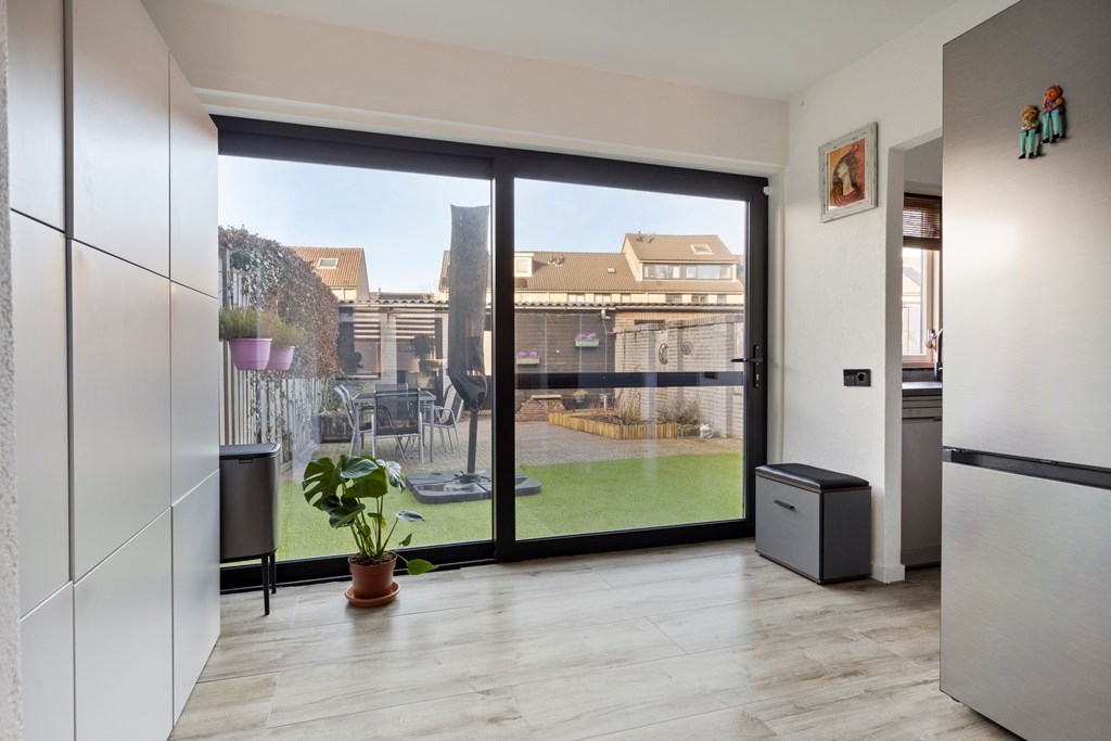 Door deze raampartij is er veel lichtinval in de woonkamer. Vanuit de woonkamer is er toegang tot een halletje met een trapopgang naar de eerste verdieping. Een trapkast zorgt voor extra bergruimte. Het toilet is deels betegeld en v.v. een hangend toilet en een fonteintje. De vloer van de begane grond is v.v. laminaat. De wanden zijn afgewerkt met stucwerk en behang. De plafonds zijn afgewerkt met stucwerk. De kozijnen zijn van hout en van kunststof en v.v. HR++ glas.
