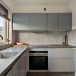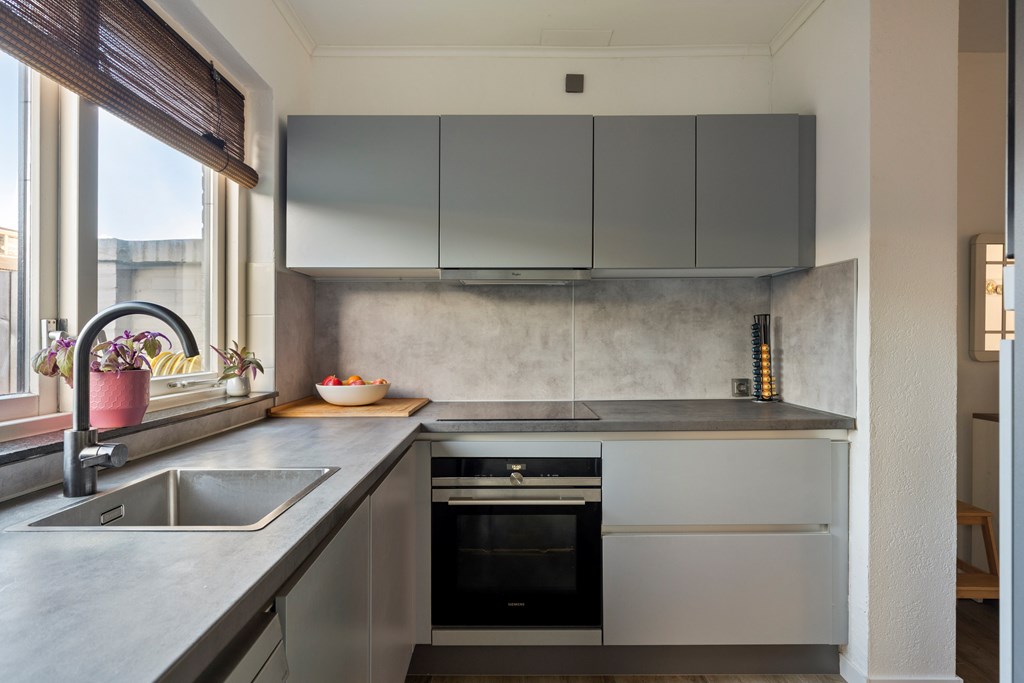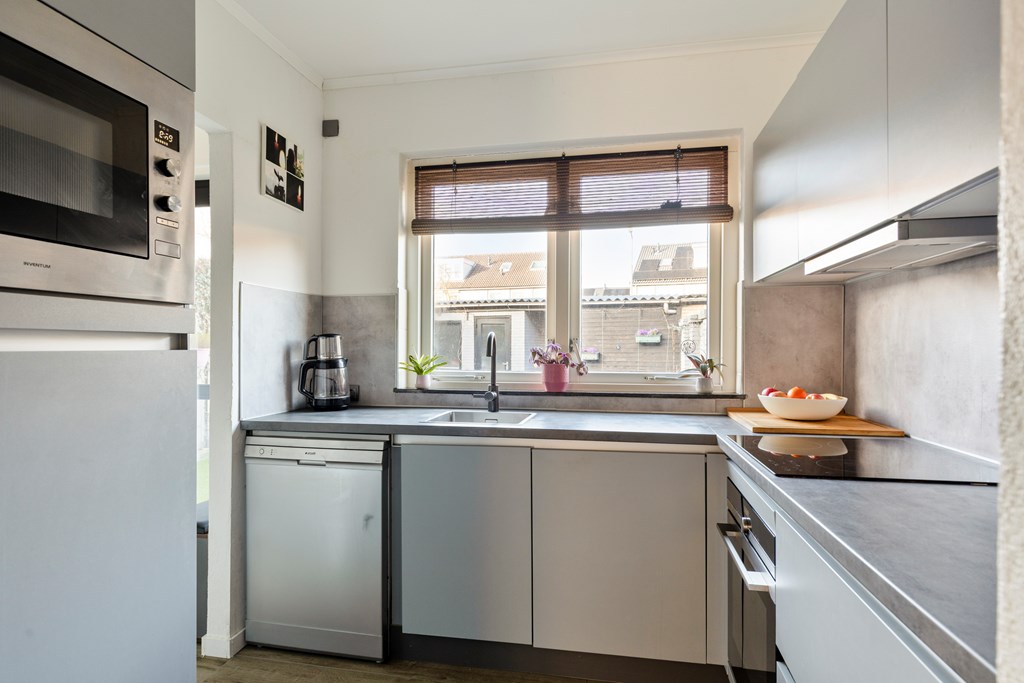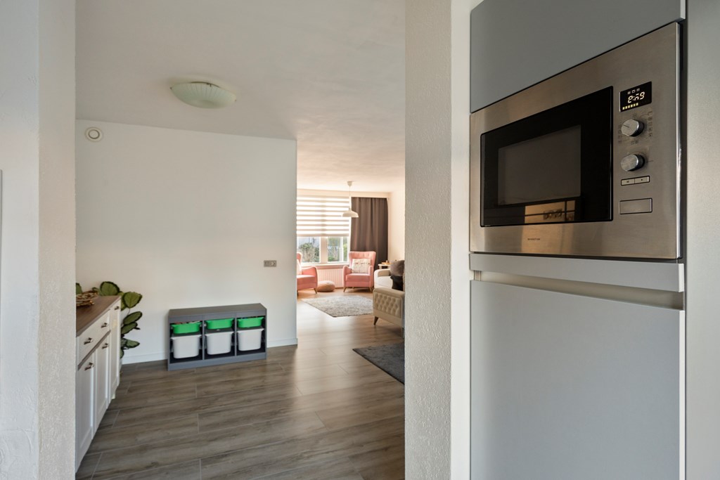 in L-vorm is v.v. diverse kasten en lades, een kunststof werkblad met spoelbak en mengkraan, keramische kookplaat, afzuigkap, combimagnetron, oven, koelkast en een vaatwasser. Aan de achterzijde van de woning is er middels een schuifpui toegang tot de achtertuin.