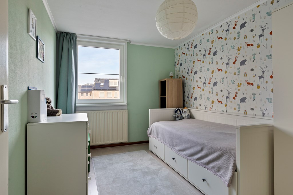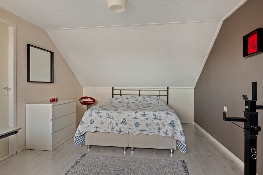 Middels een vaste trap is de voorzolder bereikbaar. Hier zijn de aansluiting voor de wasmachine en de cv-ketel gesitueerd. Vanuit de voorzolder is de vierde slaapkamer bereikbaar. De vloer van de tweede verdieping is v.v. laminaat. De wanden zijn afgewerkt met structuurverf en wandpanelen. De kozijnen zijn van kunststof en v.v. HR++ glas en een hor.
