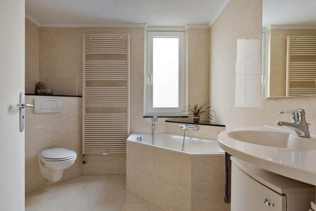 Vanuit de overloop zijn 3 ruime slaapkamers, de badkamer en de trapopgang naar de tweede verdieping bereikbaar. De badkamer is geheel betegeld en is v.v. een wastafel met meubel en een kastje, een douchecabine, een hangend toilet, een hoekbad en een designradiator. De vloer van de slaapkamers en overloop is v.v. laminaat. De wanden zijn v.v. stucwerk en behang. De plafonds zijn afgewerkt met stucwerk. De kozijnen zijn van kunststof en v.v. HR++ glas en een hor.