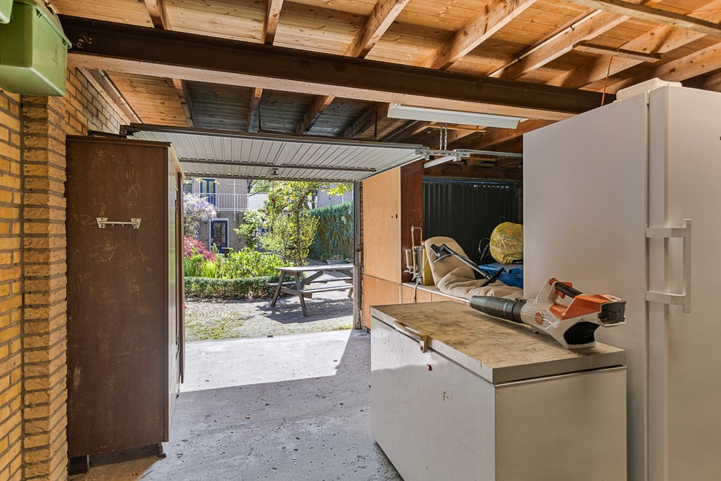 Deze woning beschikt over een royale groene voor-en achtertuin. Vanuit de inrit met parkeergedeelte is de achtertuin bereikbaar. Deze tuin biedt veel privacy omdat er geen achterburen zijn. De achtertuin is aangelegd met sierbestrating, een vijver, diverse borders met vaste beplanting, struiken en bomen. Achter in de tuin is een dubbele garage aanwezig en een overdekt gedeelte voor bv. houtopslag. De voortuin is eveneens aangelegd met sierbestrating en diverse vaste beplanting en boompjes.