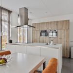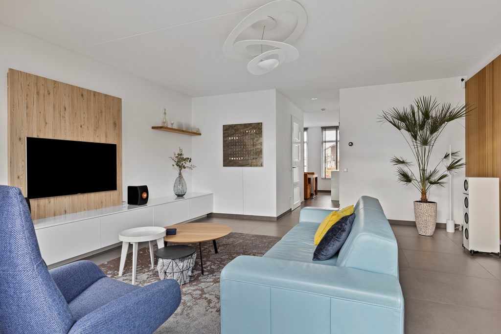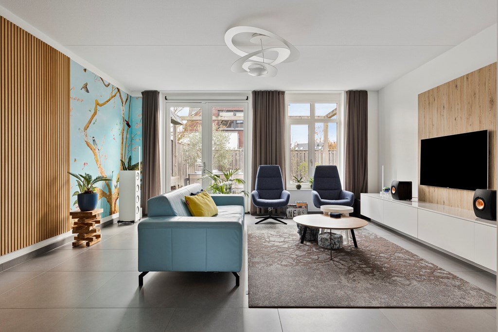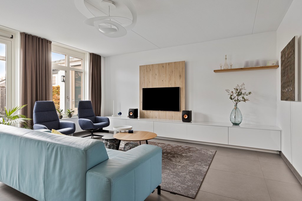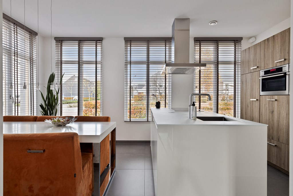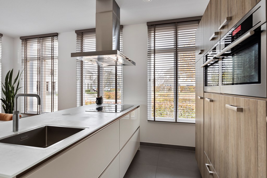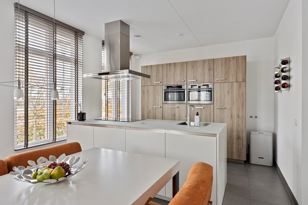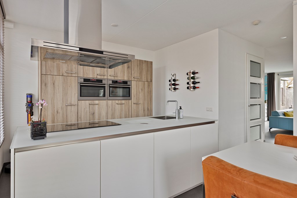 Vanuit de hal/entree met meterkast is er toegang tot het toilet en het middengedeelte van de woning. Vanuit dit middengedeelte is een halletje bereikbaar met de trapopgang naar de eerste verdieping. De keuken is aan de voorzijde van de woning gelegen. De woonkamer is aan de achterzijde gelegen en hierdoor is er een prettig zicht op de achtertuin welke bereikbaar is middels openslaande tuindeuren. De rechte keuken met kookeiland (van Diessen) en wandopstelling is v.v. diverse kasten en lades, een glazen aanrechtblad met spoelbak en kokend waterkraan (Quooker), inductiekookplaat (Siemens), afzuigkap, combimagnetron, vriezer en oven (allen AEG), koelkast (Liebherr) en vaatwasser (Miele).