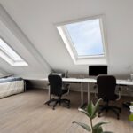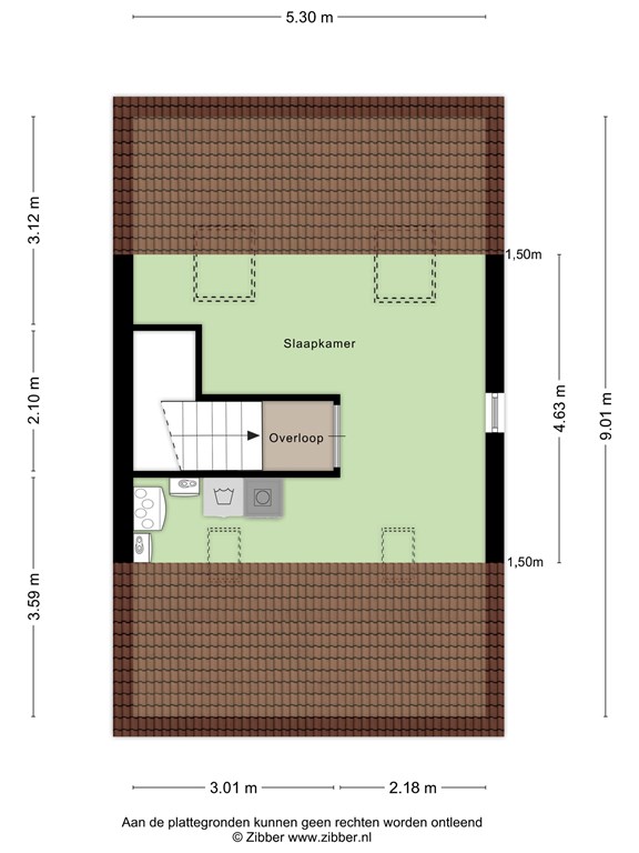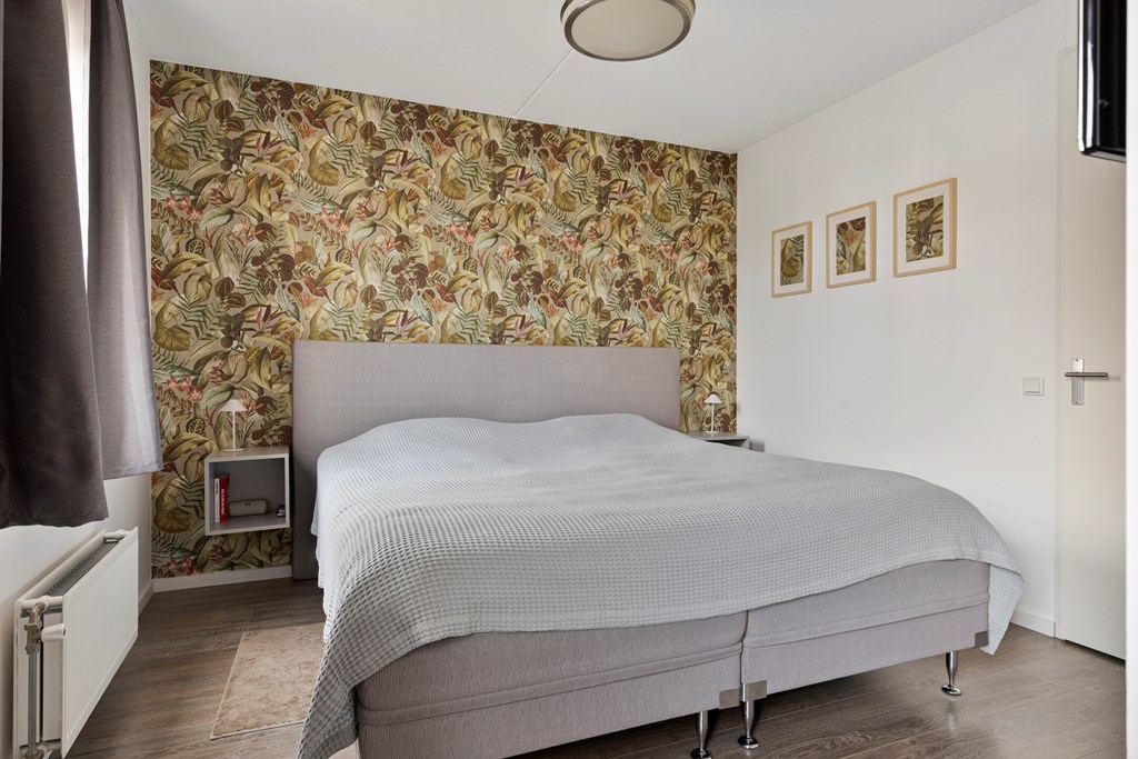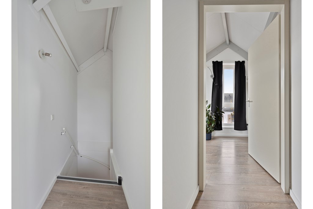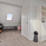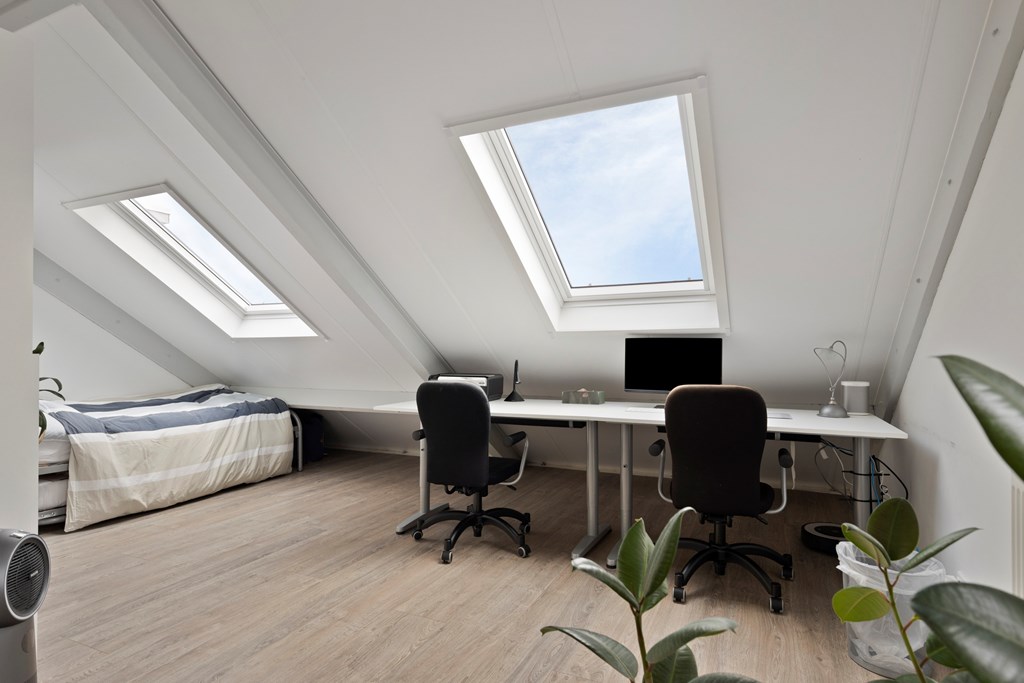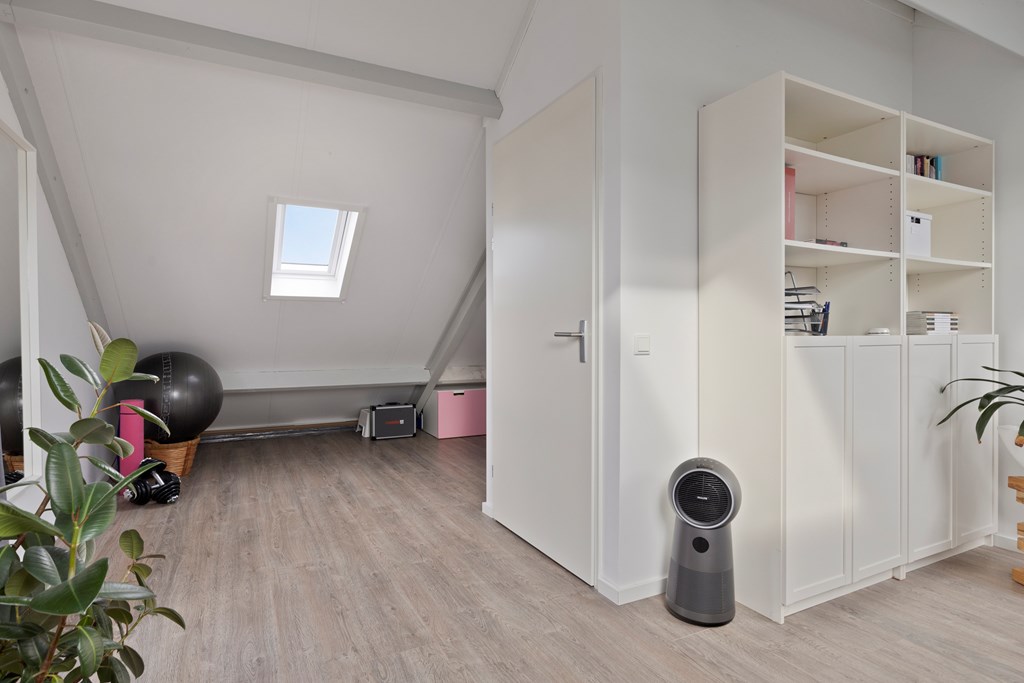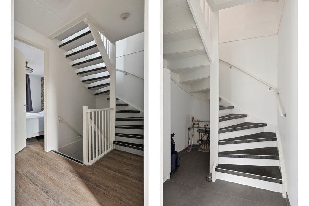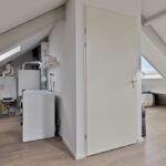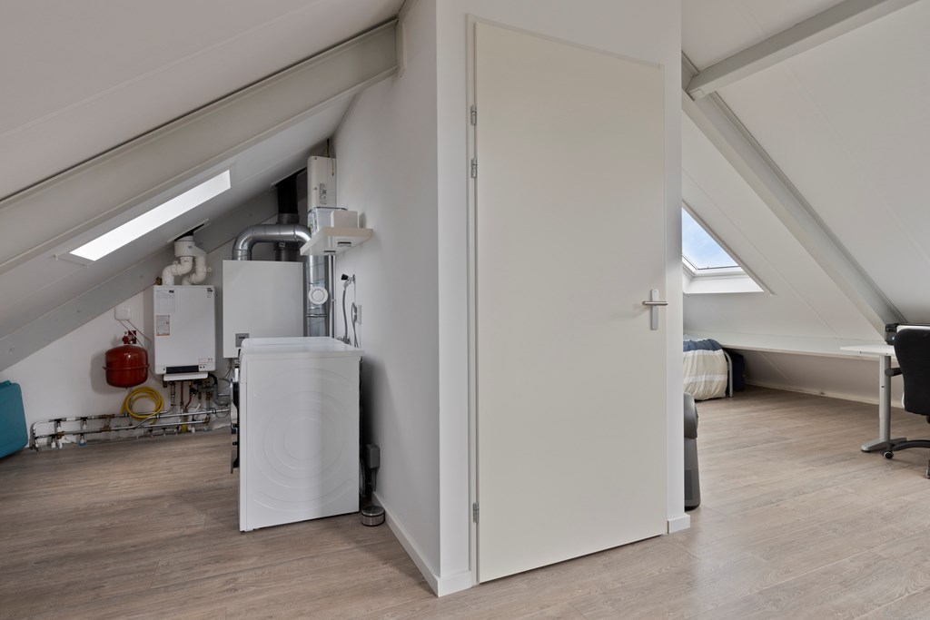 De vaste trap naar de tweede verdieping is eveneens afgewerkt met leren trapbekleding. Vanuit een overloop is de ruime 4e slaapkamer bereikbaar. Hier zijn tevens de aansluiting voor de wasmachine, de cv-ketel met ventilatie-warmtepomp en de omvormer voor de zonnepanelen gesitueerd. De vloer van deze verdieping is v.v. laminaat. De wanden zijn afgewerkt met stucwerk. De dakramen zijn van hout met HR++ glas en zijn v.v. screens.