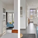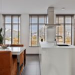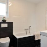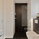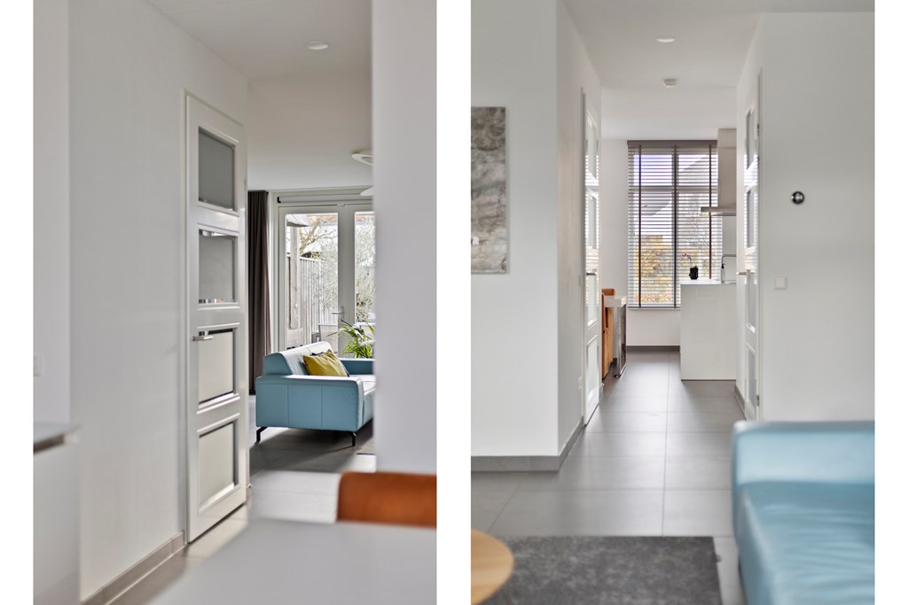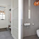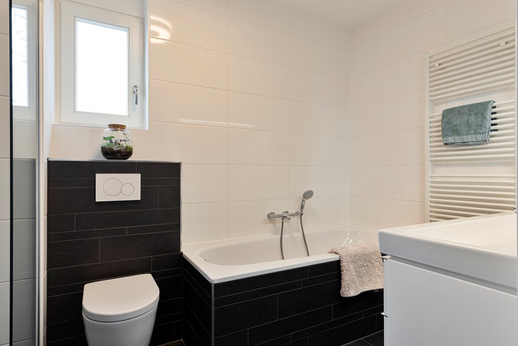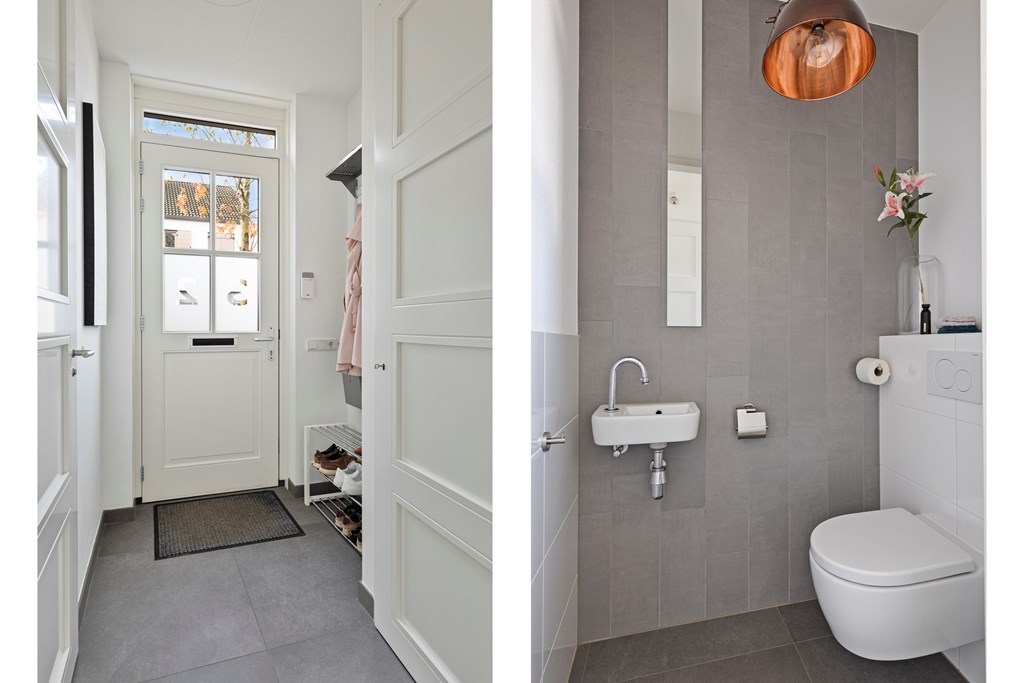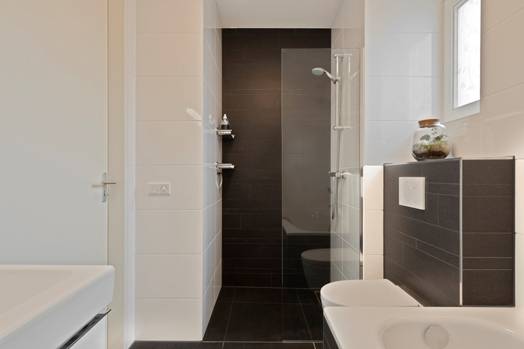 Het moderne toilet is deels betegeld en v.v. een hangend toilet en fonteintje. De vloer van de begane grond is v.v. tegels met vloerverwarming. De wanden zijn afgewerkt met stucwerk. De plafonds zijn v.v. spuitwerk. De kozijnen zijn van hout met HR++ glas.