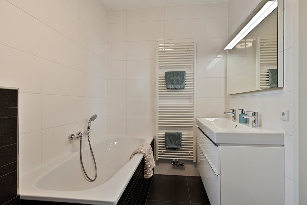 Vanuit de overloop zijn 3 slaapkamers (1 met inloopkast), de badkamer en de trapopgang naar de tweede verdieping bereikbaar. De badkamer is geheel betegeld en v.v. een dubbele wastafel met meubel, een hangend toilet, een ligbad, inloopdouche en een designradiator. De vloer van overloop en de slaapkamers is v.v. laminaat. De wanden zijn afgewerkt met stucwerk en de plafonds met spuitwerk. De kozijnen zijn van hout met HR++ glas en v.v. houten luiken.