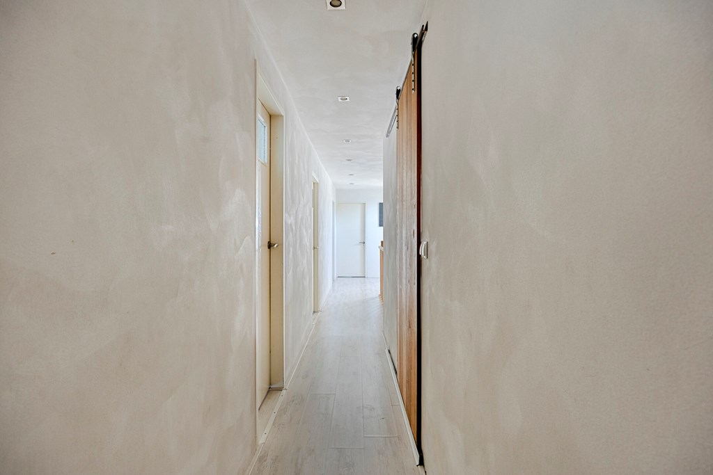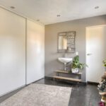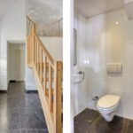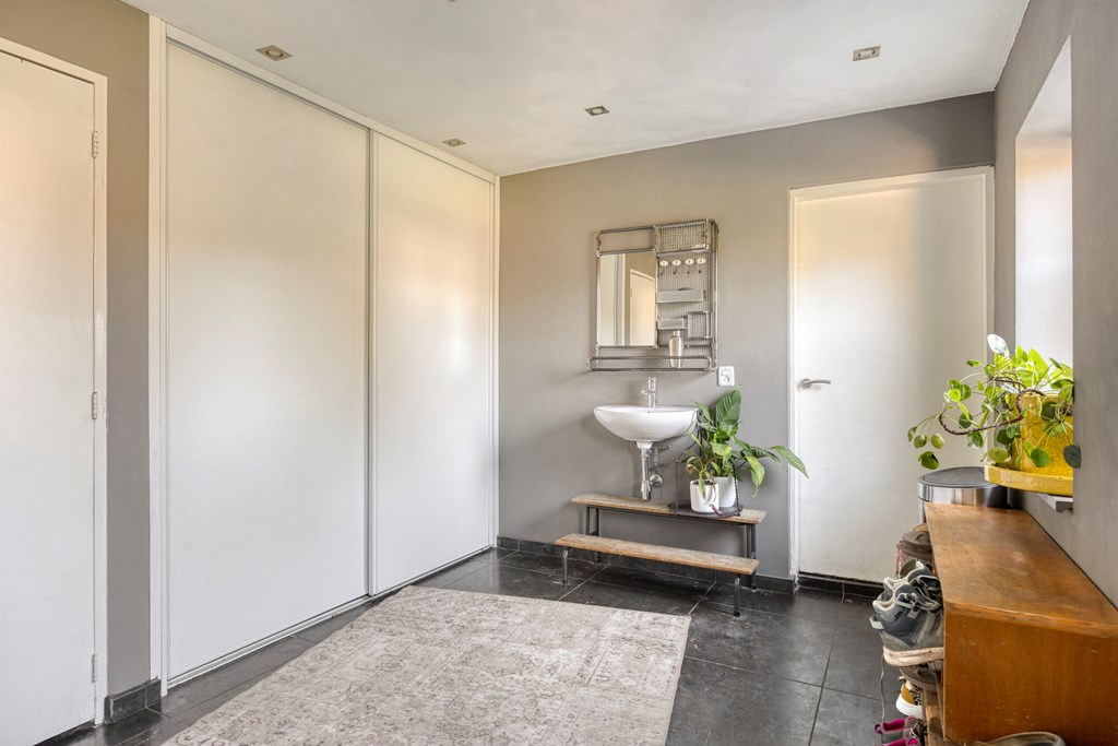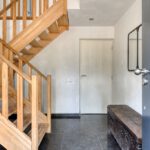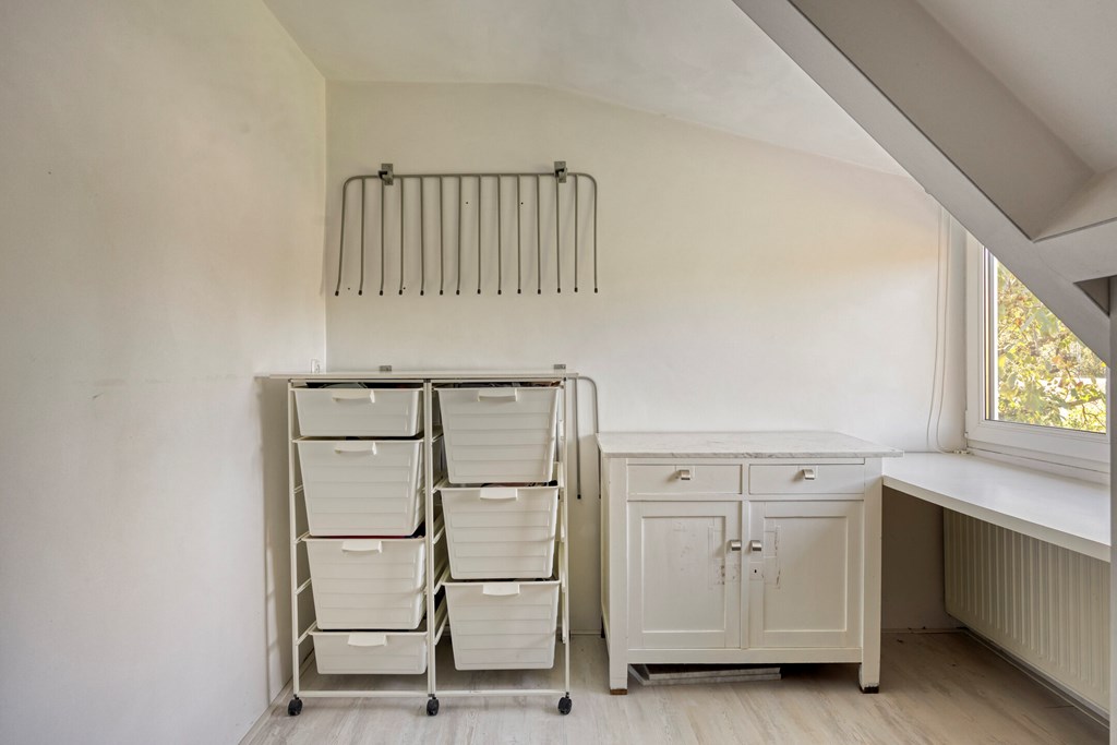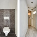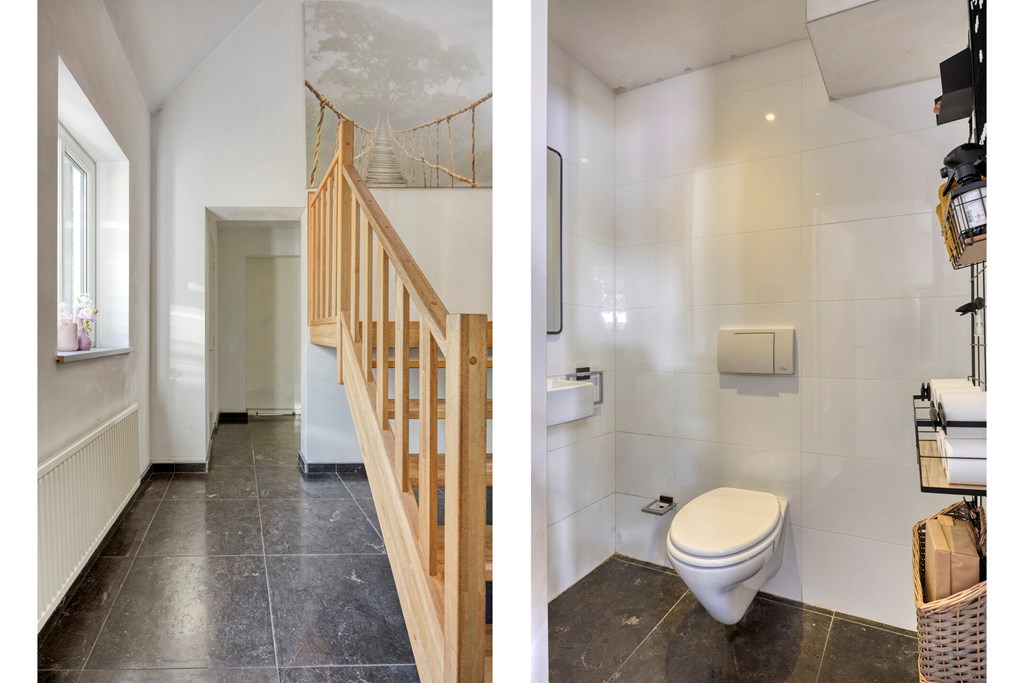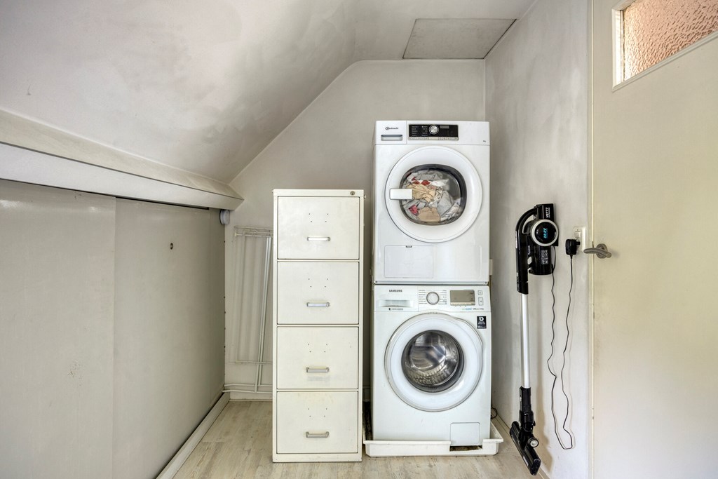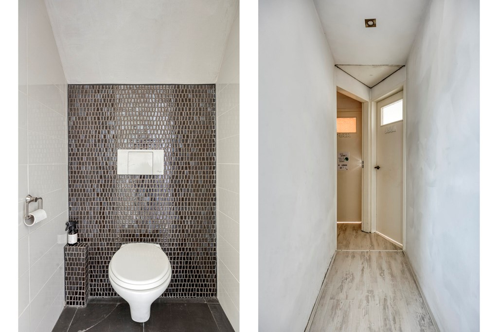Vanuit de keuken is er toegang tot de bijkeuken met ruime inbouwkasten en een wastafel. Vanuit de bijkeuken is een technische ruimte bereikbaar waar de cv-ketel gesitueerd is. Zowel de garage als de achtertuin zijn bereikbaar via de bijkeuken. Het toilet is geheel betegeld en v.v. een hangend toilet en fonteintje. De wanden en plafonds zijn afgewerkt met stucwerk. De vloer van de begane grond is v.v. een Chinese hardstenen vloer met vloerverwarming (m.u.v. de garage en het toilet). De kozijnen zijn van kunststof met HR++ glas. De deuren zijn van hout.