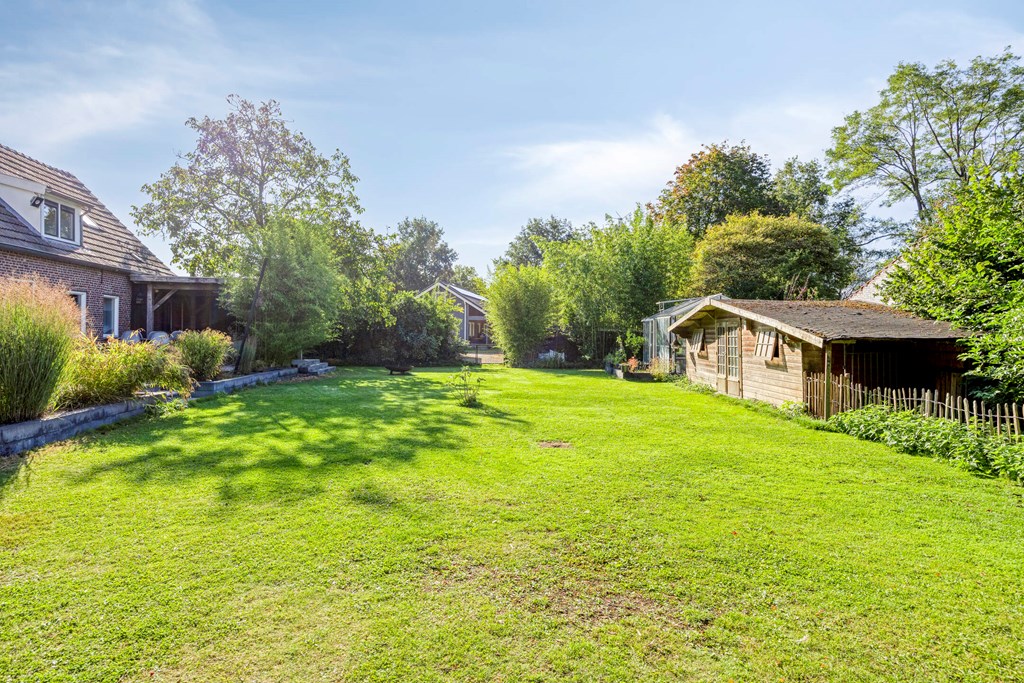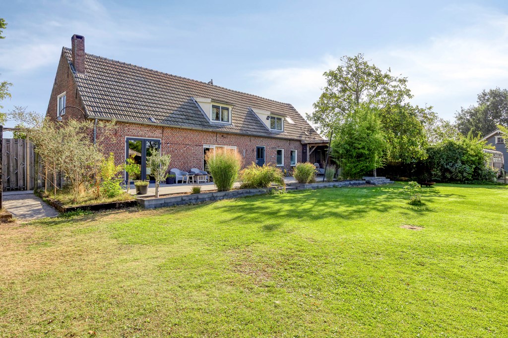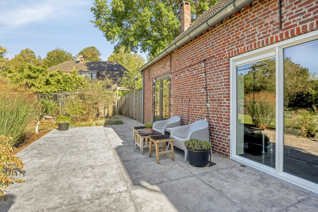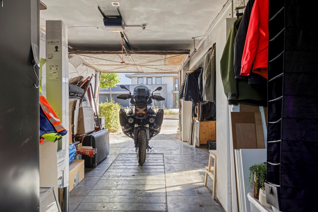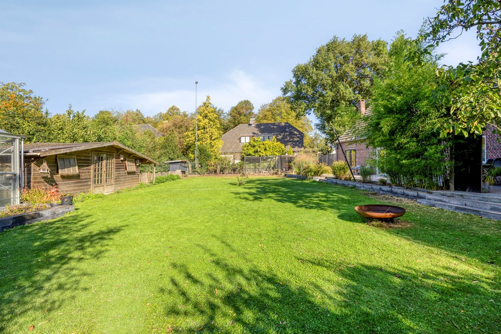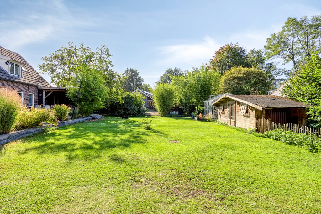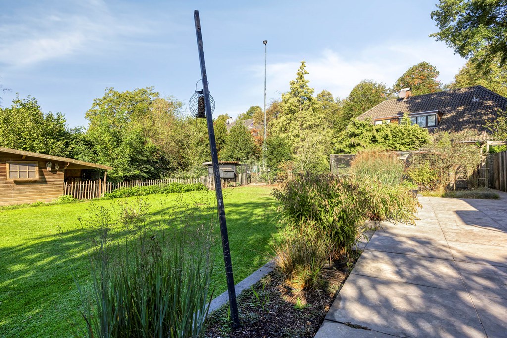 Deze woning beschikt over een inpandige garage welke vanuit de bijkeuken bereikbaar is. Aan de voorzijde van de woning is de garage bereikbaar middels een elektrische deur. Tevens is langs de garage een carport aanwezig. Vanuit de woonkeuken, de bijkeuken en de garage is er toegang tot de achtertuin met een royaal terras waarvan een gedeelte overkapt is. De achtertuin is aangelegd met sierbestrating, gazon, bomen, struiken en borders met vaste beplanting. In de achtertuin zijn tevens een houten berging en een kas gesitueerd. De voortuin is aangelegd met sierbestrating, hagen en sierboompjes. Langs de woning is een inrit aangelegd welke plaats biedt voor meerdere auto’s. Vanuit de inrit is middels een houten poort de achtertuin bereikbaar.