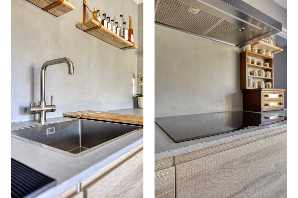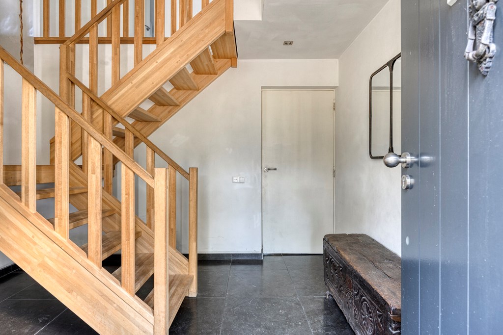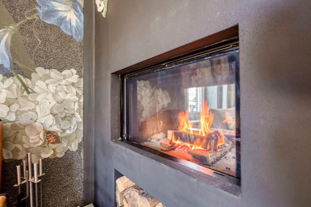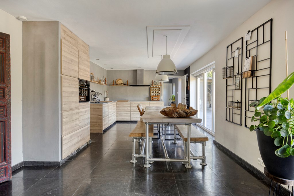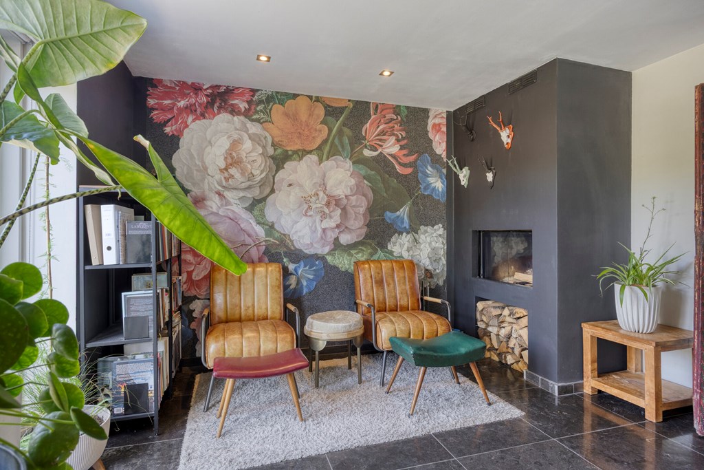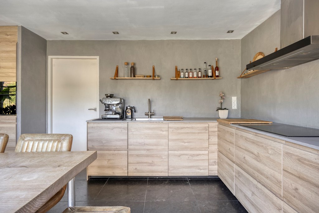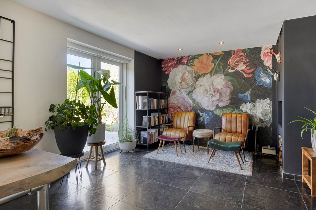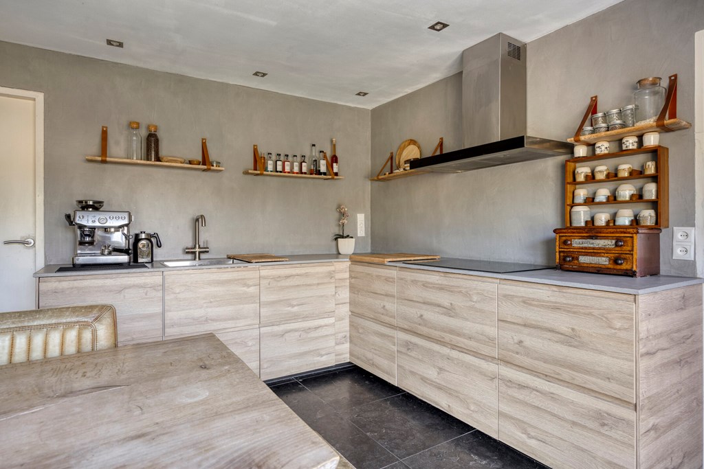 Vanuit de ruime hal/entree met eikenhouten trap naar de eerste verdieping is er toegang tot de werkkamer, het toilet en de royale woonkeuken met grote raampartijen en openslaande tuindeuren naar de achtertuin. Vanuit deze woonkeuken is er middels fraai bewerkte deuren toegang tot de woonkamer. In de woonkamer en de keuken bevindt zich een sfeervolle doorkijkhaard. De keuken in L-vorm en met wandkast is v.v. diverse kasten en lades, een draaicarrousel, een werkblad van hout met beton cirré, een spoelbak met kokend waterkraan, een inductiekookplaat, afzuigkap, combimagnetron, koelkast en een vaatwasser.