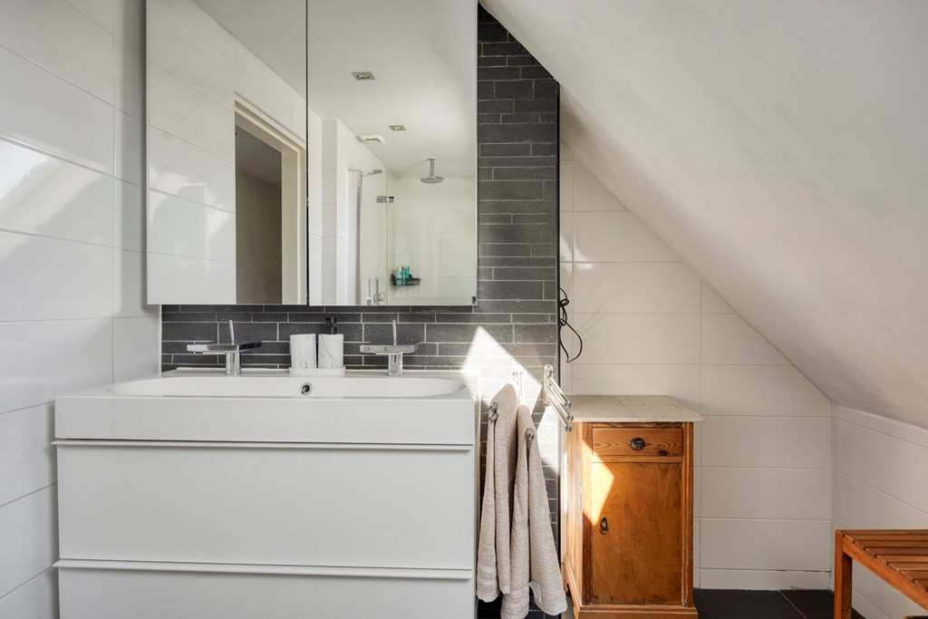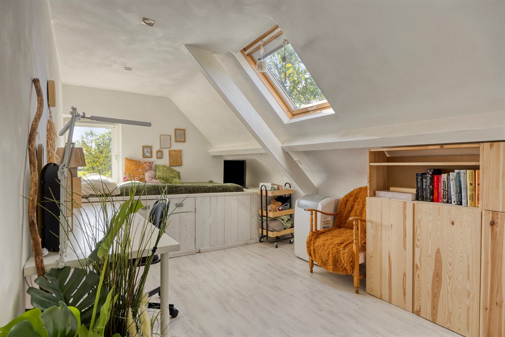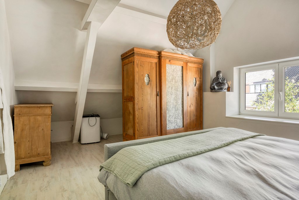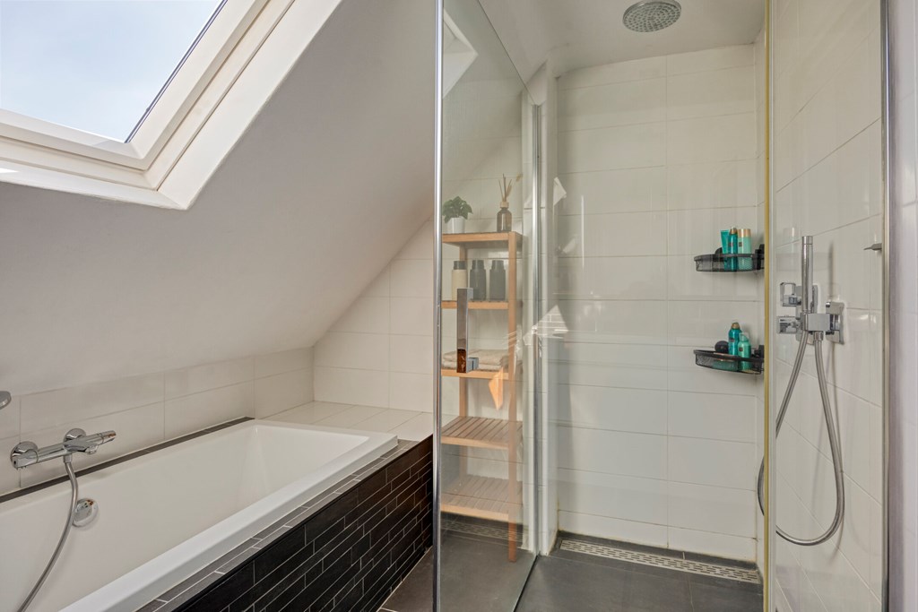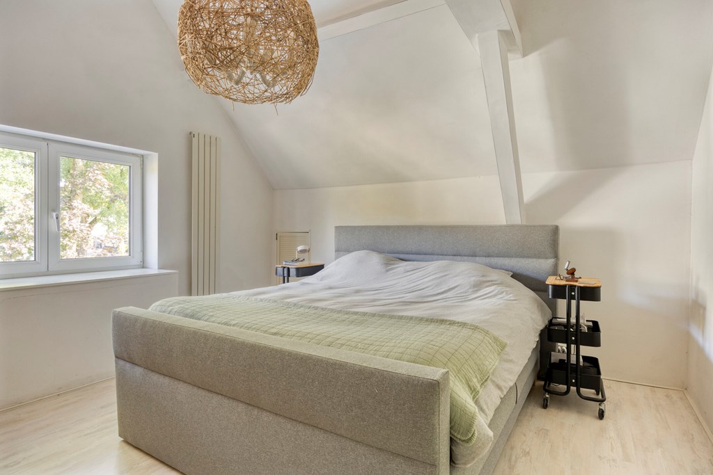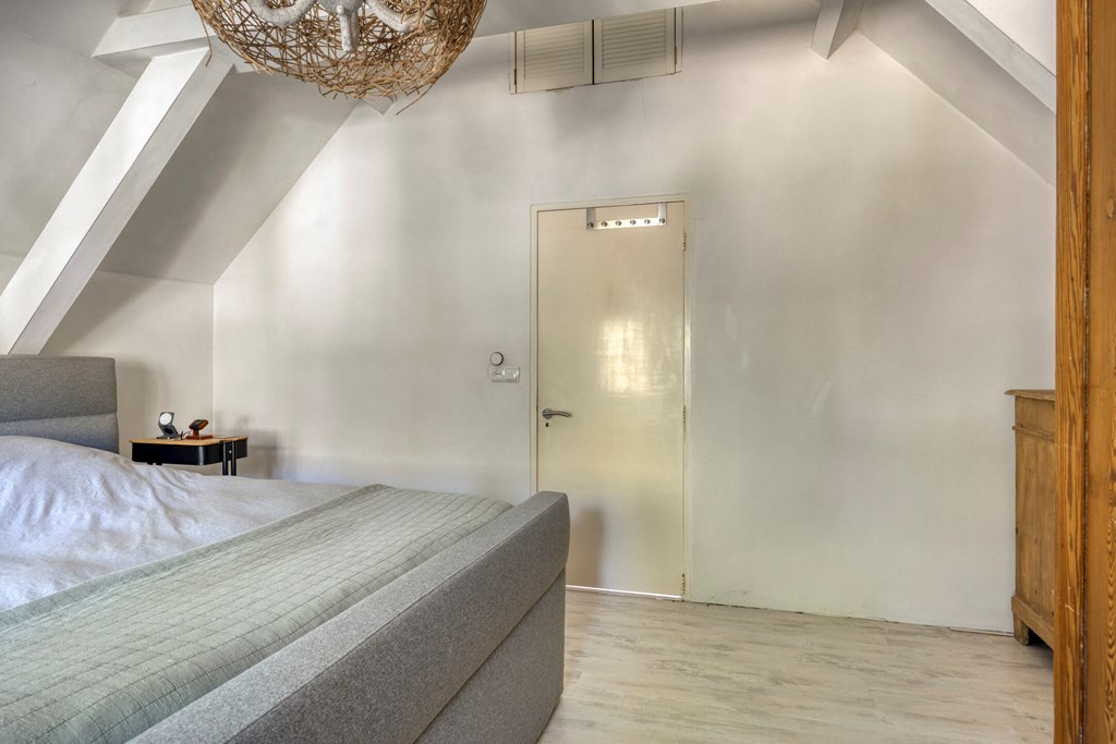 Vanuit de overloop met vide zijn 5 slaapkamers, een separaat toilet, een berging en de badkamer bereikbaar. De badkamer is geheel betegeld en v.v. een dubbele wastafel met meubel, een douchecabine met regendouche en een ligbad. Het separaat toilet is eveneens geheel betegeld en v.v. een hangend toilet. Op één van de slaapkamers is de aansluiting voor de wasmachine gesitueerd. Ook is er vanuit één van de slaapkamers toegang tot een bergzolder.