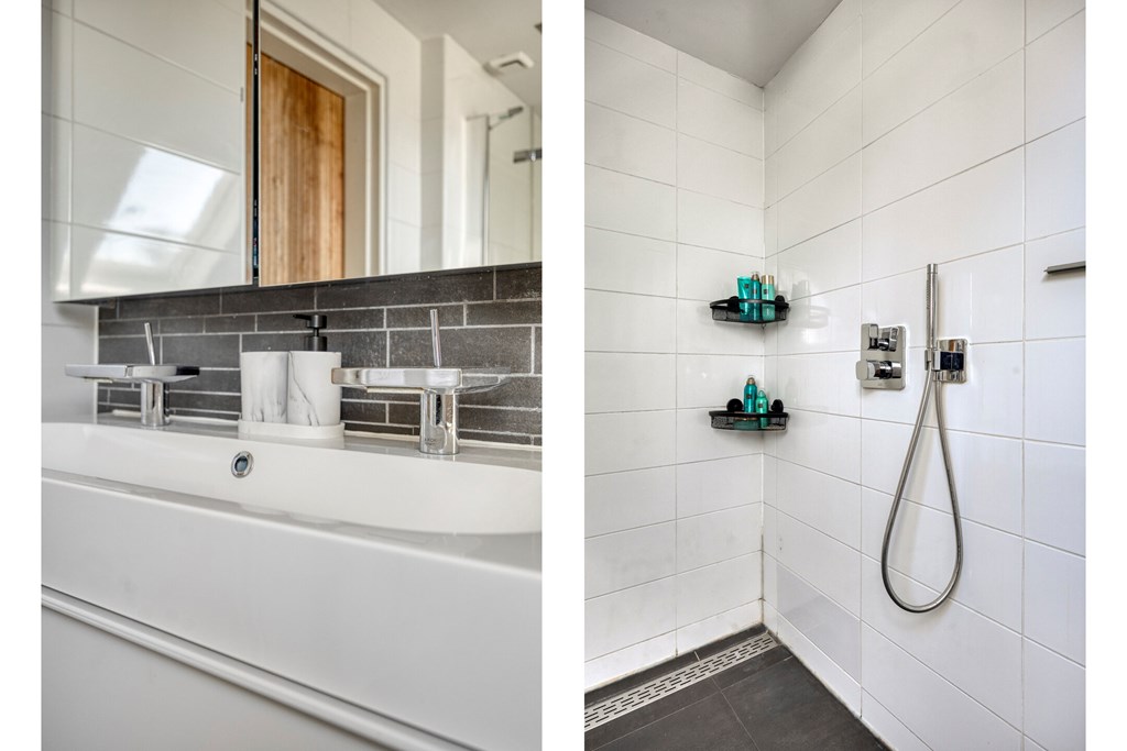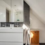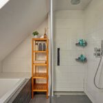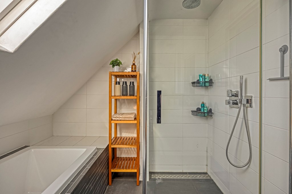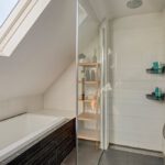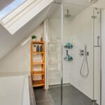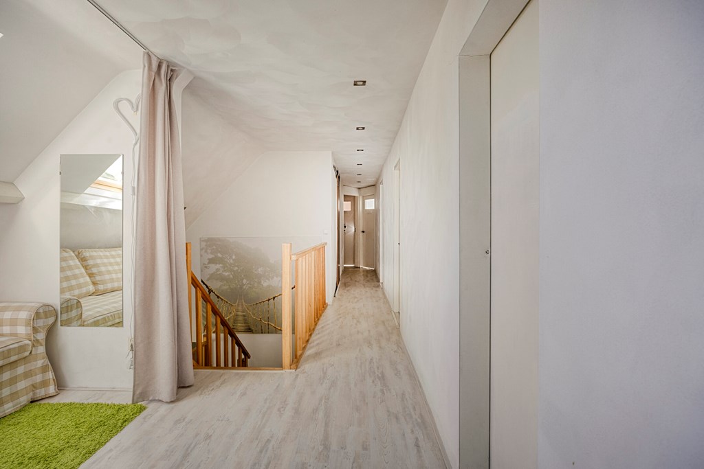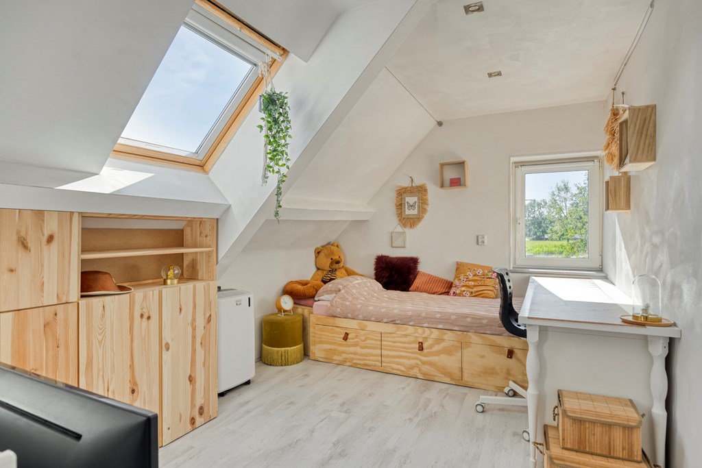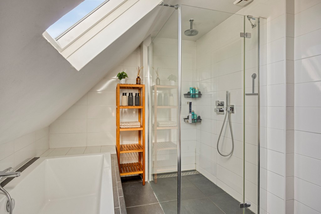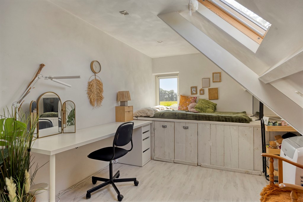 Vanuit de overloop met vide zijn 5 slaapkamers, een separaat toilet, een berging en de badkamer bereikbaar. De badkamer is geheel betegeld en v.v. een dubbele wastafel met meubel, een douchecabine met regendouche en een ligbad. Het separaat toilet is eveneens geheel betegeld en v.v. een hangend toilet. Op één van de slaapkamers is de aansluiting voor de wasmachine gesitueerd. Ook is er vanuit één van de slaapkamers toegang tot een bergzolder.